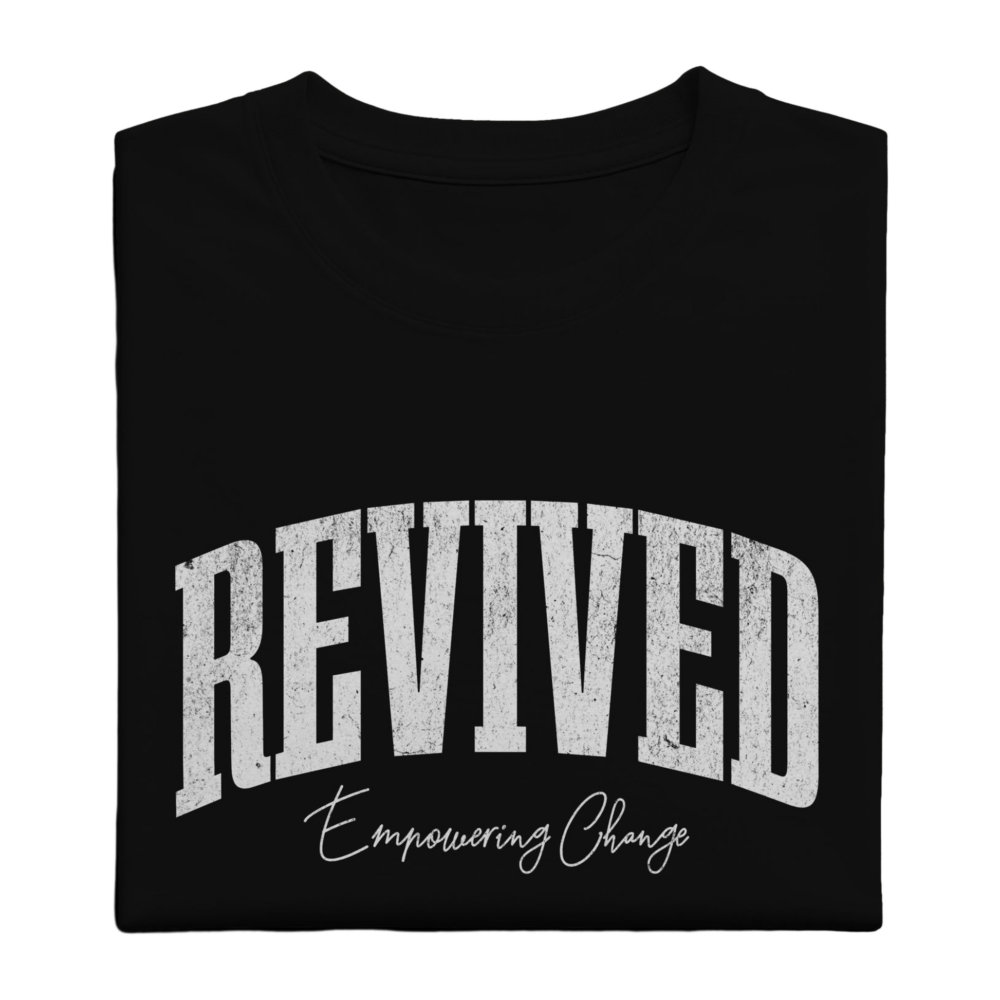 A bold statement for a bold movement. The REVIVED "Empowering Change" tee speaks truth with attitude. Featuring distressed varsity-style grunge lettering across the chest and our signature message underneath in a script font, this tee is for those rewriting their story - from the streets to a new standard.